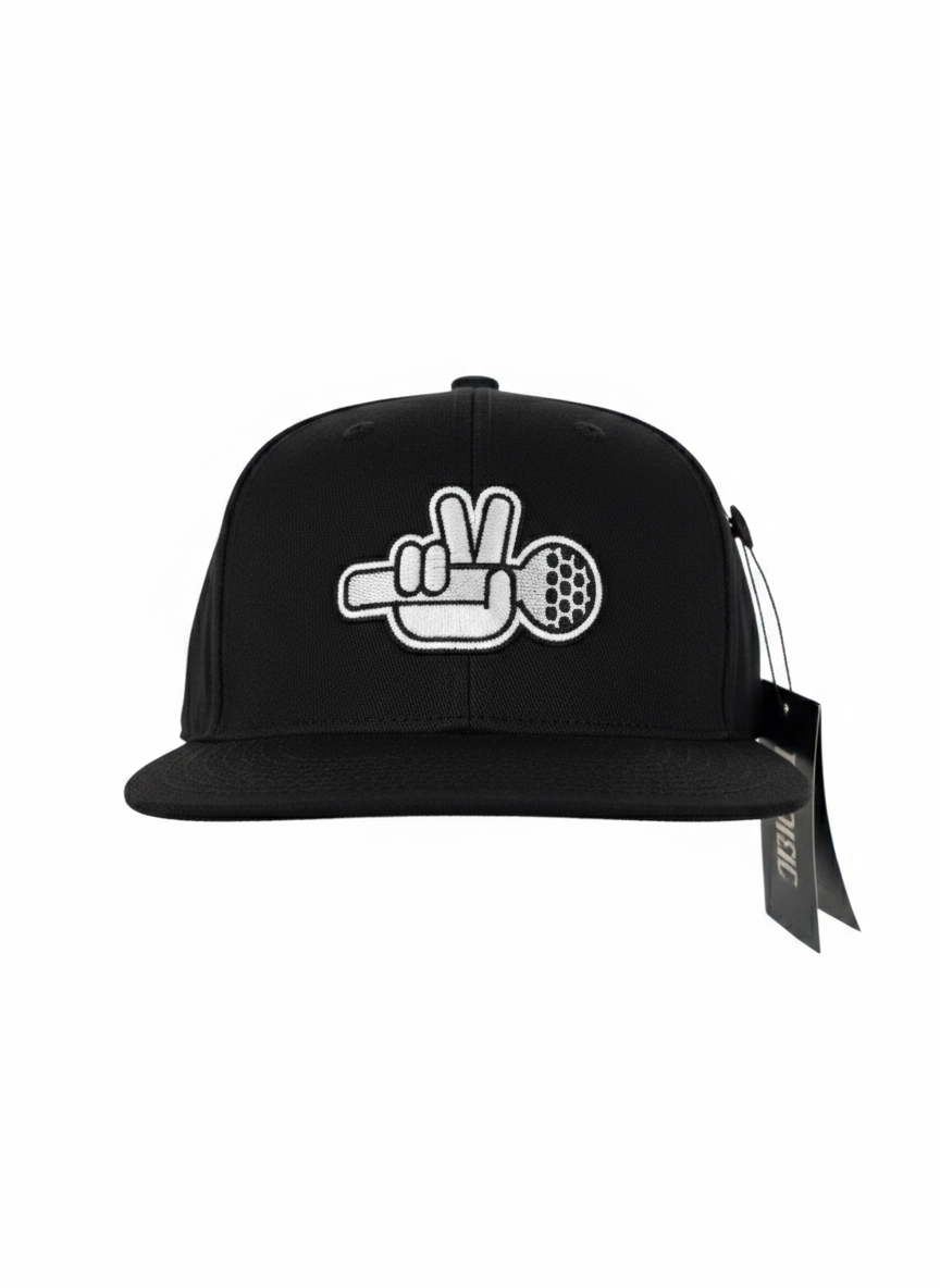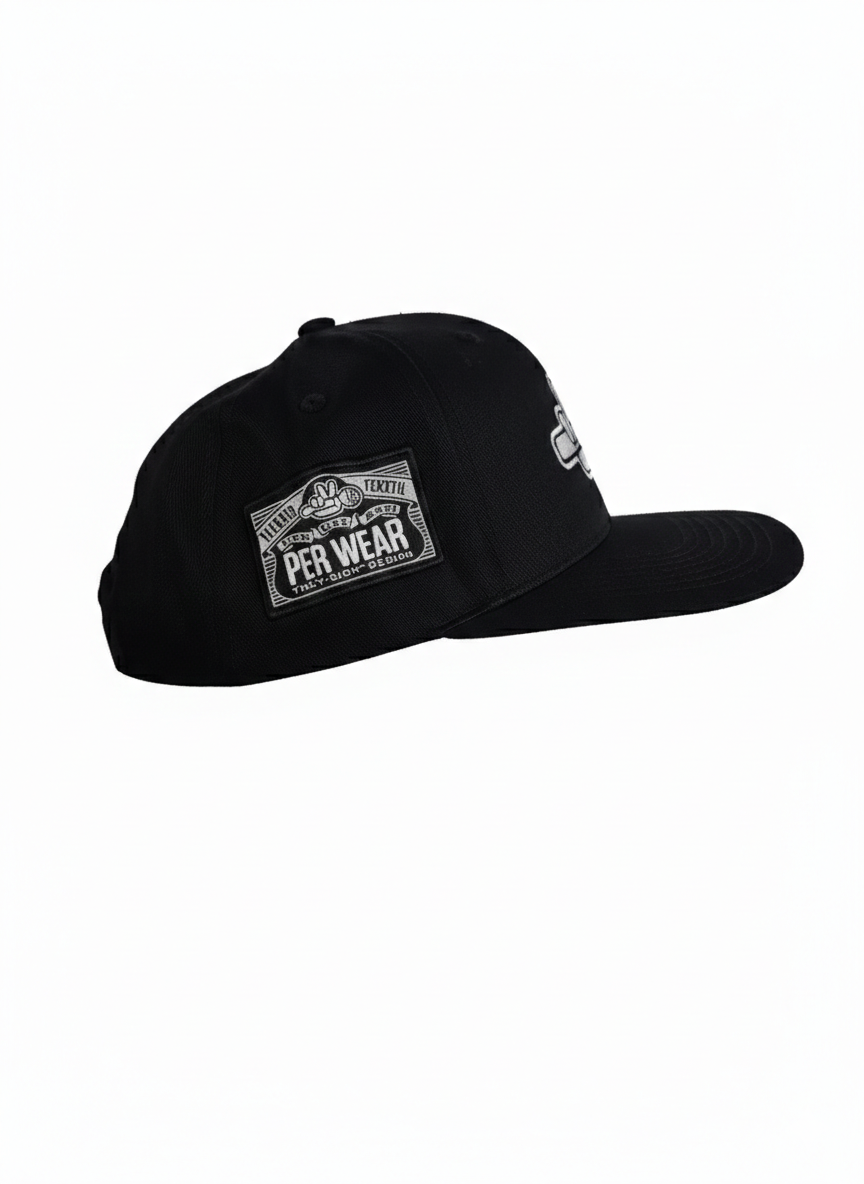 Lækker Per V logo snapback cap i sort med brodering og patch.