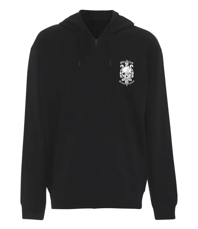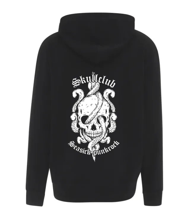 Sort hoodie med et kranie med tentakler på brystet og ryggen.